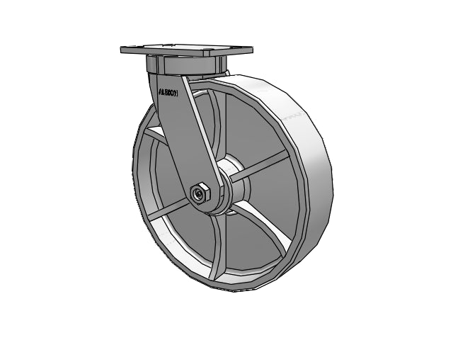 The Albion 370CA12501S swivel caster features a 12" x 3" wide wheel and a 6 1/4" x 4 1/2" top plate, capable of a 2800 lb. capacity per caster. Complete caster specifications and downloadable CAD model are provided below. Ideal for applications that are on the border of exceeding 2” wide safety factors, or where a premium 3” wide caster may be overkill for the application or budget. This series provides the next step in a trusted, economical solution. Be sure to also review our premium 3” wide 75 Series featuring a 3-year warranty, USA-made rigs, higher load capacities, and higher performance wheels. The 370 Series also supports towed applications, contact us prior to ordering to ensure your selection meets your towing requirements.