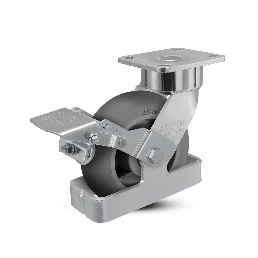 28XR06228SFBKTO is a 6" x 2" wide wheel brake caster with a Performance Rubber Donut Wheel and 4-1/2" x 4'' top plate designed and constructed for highly ergonomic and quiet operation. Featuring a USA-made rig with a sealed-precision-ball-bearing raceway and extended lead, this caster provides effortless mobility and is extremely quiet, providing a safer working environment for your employees. The caster requires no maintenance for life, featuring sealed precision ball bearings in wheel and swivel section (for swivel models). 1/4" steel construction with fully welded legs (welded inside and outside to yoke base) allow these highly ergonomic casters to perform at higher load capacities than traditional casters, even with the extended lead – which helps smoothly and easily align the casters when turning while also reducing unwanted chatter from towed or faster moving equipment. The performance rubber wheel provides additional shock absorption for your equipment and cargo, and also helps further reduce noise. These tough, USA-made wheels also reject debris, including metal shavings and screws and feature sealed precision ball bearings for smooth and easy mobility. The included face brake provides easy to engage positive braking action against the wheel face, ensuring a solid lock. The provided toe guard helps to protect toes and other debris from being ran over and is cleanly integrated into the laser cut legs. This maintenance-free and ergonomic series also features: