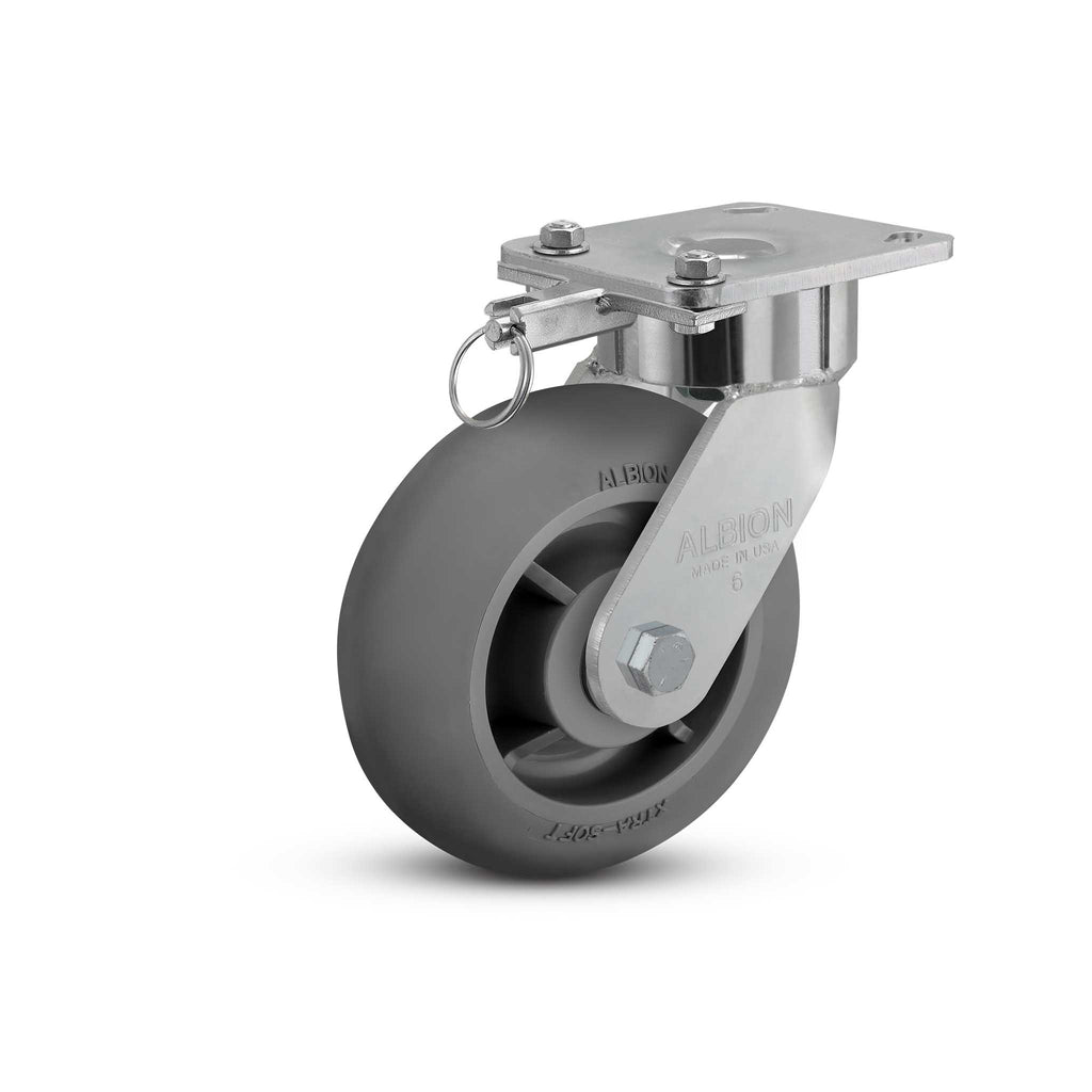 28XR06228SL is a 6" x 2" wide wheel swivel caster with a Performance Rubber Donut Wheel and 4-1/2" x 4'' top plate designed and constructed for highly ergonomic and quiet operation. Featuring a USA-made rig with a sealed-precision-ball-bearing raceway and extended lead, this caster provides effortless mobility and is extremely quiet, providing a safer working environment for your employees. The caster requires no maintenance for life, featuring sealed precision ball bearings in wheel and swivel section (for swivel models). 1/4" steel construction with fully welded legs (welded inside and outside to yoke base) allow these highly ergonomic casters to perform at higher load capacities than traditional casters, even with the extended lead – which helps smoothly and easily align the casters when turning while also reducing unwanted chatter from towed or faster moving equipment. The performance rubber wheel provides additional shock absorption for your equipment and cargo, and also helps further reduce noise. These tough, USA-made wheels also reject debris, including metal shavings and screws and feature sealed precision ball bearings for smooth and easy mobility. A swivel lock is included to allow for easy steering; simply engage the swivel into one of the four positions to easily turn the swivel caster in a rigid caster (release to turn it right back into a free swiveling caster). This maintenance-free and ergonomic series also features: