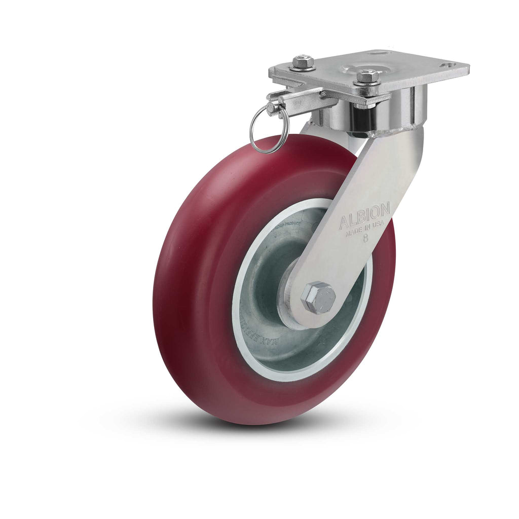 28AX08228S01L is a 8" x 2" wide wheel swivel caster with a Maroon MAX-Efficiency Wheel and 4-1/2" x 4'' top plate designed and constructed for highly ergonomic and quiet operation. Featuring a USA-made rig with a sealed-precision-ball-bearing raceway and extended lead, this caster provides effortless mobility and is extremely quiet, providing a safer working environment for your employees. The caster requires no maintenance for life, featuring sealed precision ball bearings in wheel and swivel section (for swivel models). 1/4" steel construction with fully welded legs (welded inside and outside to yoke base) allow these highly ergonomic casters to perform at higher load capacities than traditional casters, even with the extended lead – which helps smoothly and easily align the casters when turning while also reducing unwanted chatter from towed or faster moving equipment. The advanced polyurethane on aluminum MAX-Efficiency (85A durometer) wheel provides best-in-class ergonomic advantages and durability – while also handling high-load capacities and debris rejection. The wheel is truly a quiet workhorse, and even features uniquely designed self-retaining top-hats that prevent hundreds of thousands of zip ties from being thrown away each year. A swivel lock is included to allow for easy steering; simply engage the swivel into one of the four positions to easily turn the swivel caster in a rigid caster (release to turn it right back into a free swiveling caster). This maintenance-free and ergonomic series also features: