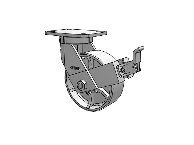 The Albion 410CA08501SFBB swivel caster with Top Wheel Lock brake features a 8" x 3" wide wheel and a 7-1/4'' x 5-1/4'' top plate, capable of a 2800 lb. capacity per caster. Complete caster specifications and downloadable CAD model are provided below. This USA-made series is a 3” wide-wheel workhorse designed to handle shock and impact. Constructed from high-quality, heat-treated AISI 1045 laser-cut steel, this series provides trusted performance. Precision machined raceway, fully welded legs (inside and outside), and kingpinless design delivers superior strength in rugged applications. This series also supports towed applications, contact us prior to ordering to ensure your selection meets your towing requirements.