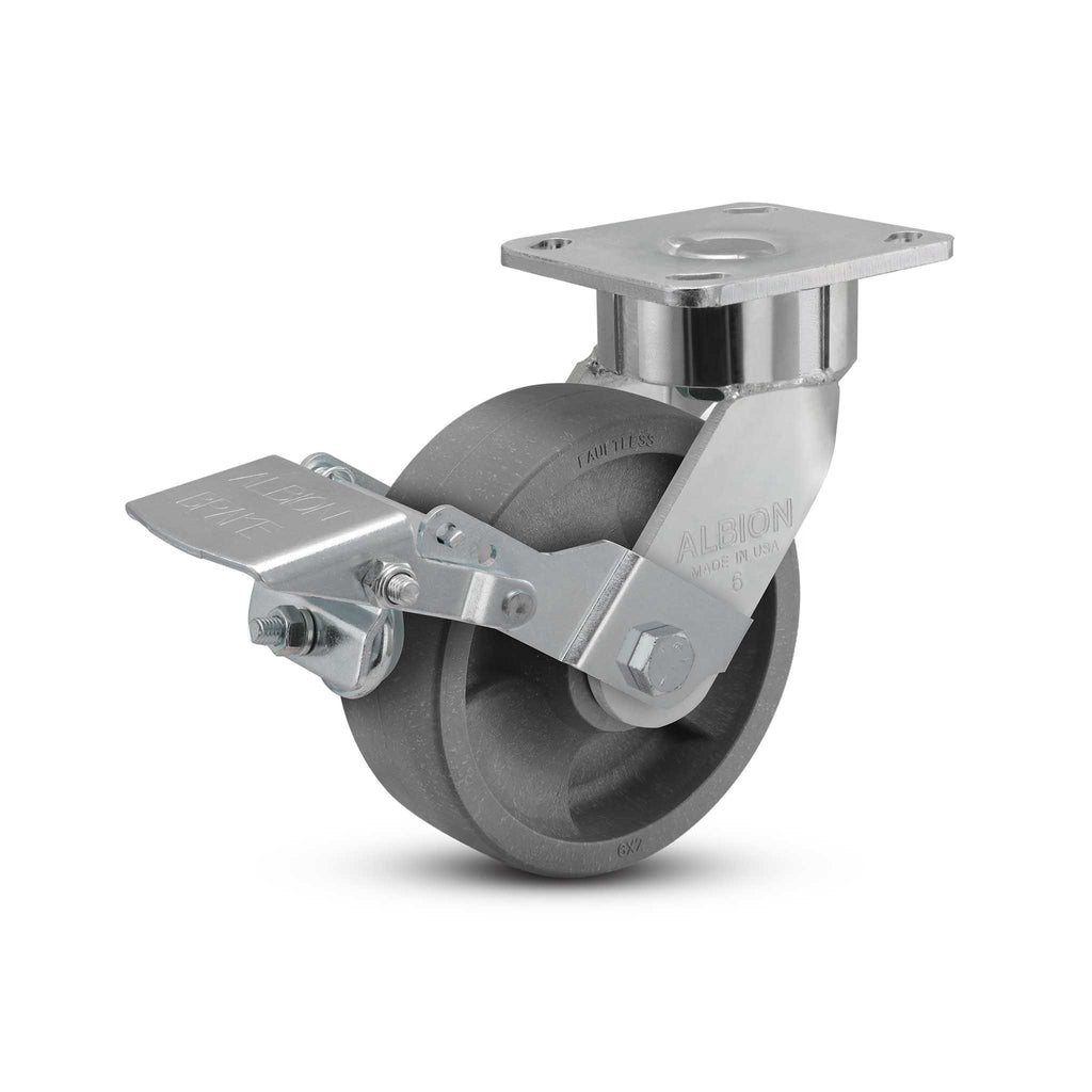28DT06228SFBK is a 6" x 2" wide wheel brake caster with a nylon wheel and 4-1/2" x 4'' top plate designed and constructed for highly ergonomic and quiet operation. Featuring a USA-made rig with a sealed-precision-ball-bearing raceway and extended lead, this caster provides effortless mobility and is extremely quiet, providing a safer working environment for your employees. The caster requires no maintenance for life, featuring sealed precision ball bearings in wheel and swivel section (for swivel models). 1/4" steel construction with fully welded legs (welded inside and outside to yoke base) allow these highly ergonomic casters to perform at higher load capacities than traditional casters, even with the extended lead – which helps smoothly and easily align the casters when turning while also reducing unwanted chatter from towed or faster moving equipment. The thick glass-filled nylon DT wheel provides excellent mobility for a range of tough applications, including food processing, tool storage, sanitary maintenance, and equipment requiring easy rolling with heavy loads. This wheel is extremely resistant to water, chemical absorption, steam cleaning, and heat (temp range -20 to 350°F with a 75-80 Shore D hardness). The included face brake provides easy to engage positive braking action against the wheel face, ensuring a solid lock. This maintenance-free and ergonomic series also features: