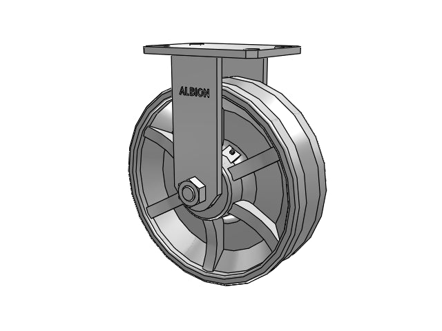 The Albion 310VG10501R rigid caster features a 10" x 3" wide wheel and a 6-1/4'' x 4-1/2'' top plate, capable of a 3500 lb. capacity per caster. Complete caster specifications and downloadable CAD model are provided below. This USA-made series is a 3” wide-wheel workhorse designed to handle shock and impact. Constructed from high-quality, heat-treated AISI 1045 laser-cut steel, this series provides trusted performance. Precision machined raceway, fully welded legs (inside and outside), and kingpinless design delivers superior strength in rugged applications. This series also supports towed applications, contact us prior to ordering to ensure your selection meets your towing requirements.