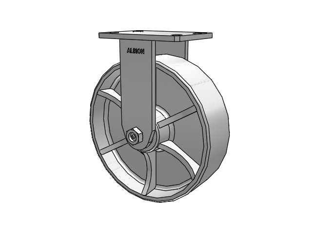 The Albion 370CA10501R rigid caster features a 10" x 3" wide wheel and a 6 1/4" x 4 1/2" top plate, capable of a 2800 lb. capacity per caster. Complete caster specifications and downloadable CAD model are provided below. Ideal for applications that are on the border of exceeding 2” wide safety factors, or where a premium 3” wide caster may be overkill for the application or budget. This series provides the next step in a trusted, economical solution. Be sure to also review our premium 3” wide 75 Series featuring a 3-year warranty, USA-made rigs, higher load capacities, and higher performance wheels. The 370 Series also supports towed applications, contact us prior to ordering to ensure your selection meets your towing requirements.