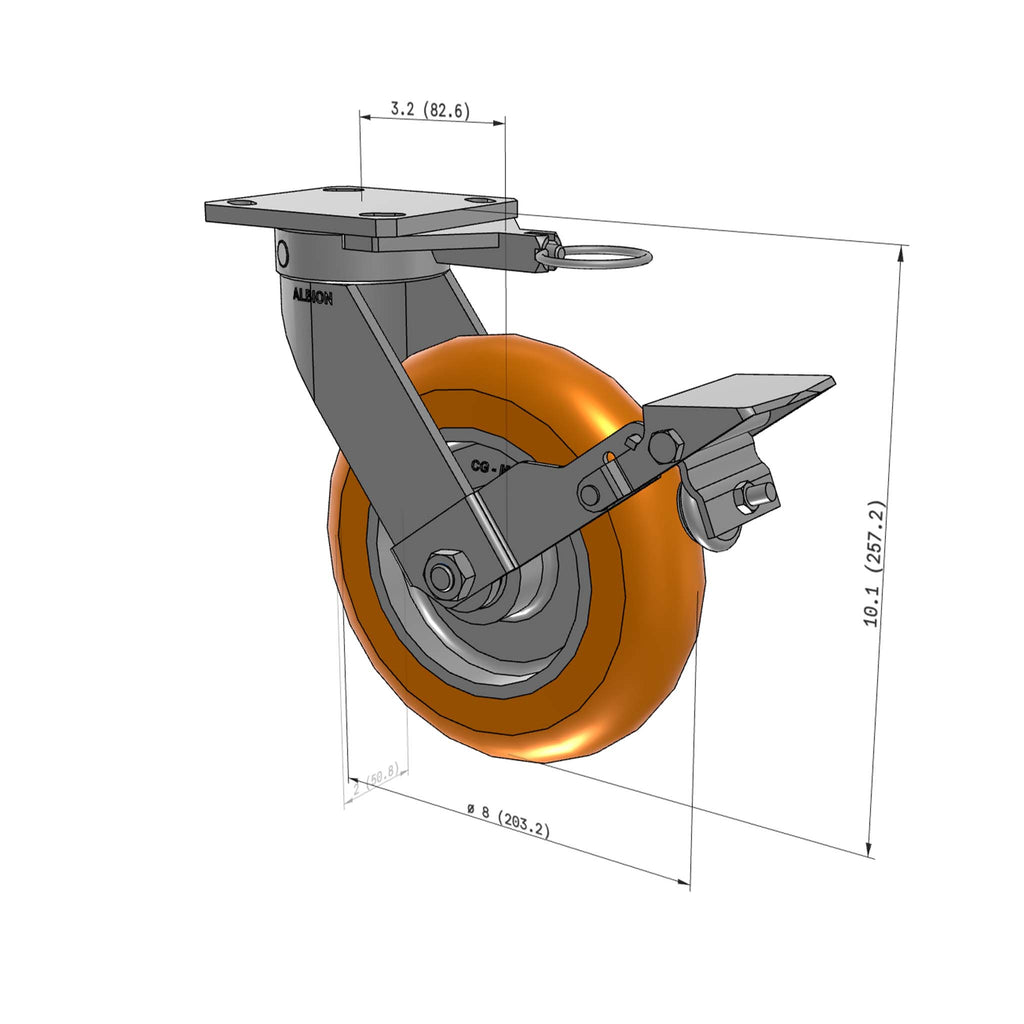 This 8" ergonomic heavy-duty swivel caster is engineered to deliver lasting performance in demanding industrial environments. Featuring an exclusive USA-made kingpinless rig with an extended lead, advanced orange MAX-Efficiency polyurethane wheel, secure metal face brake, and swivel lock – it helps reduce operator strain and improve safety when moving heavy carts and equipment.