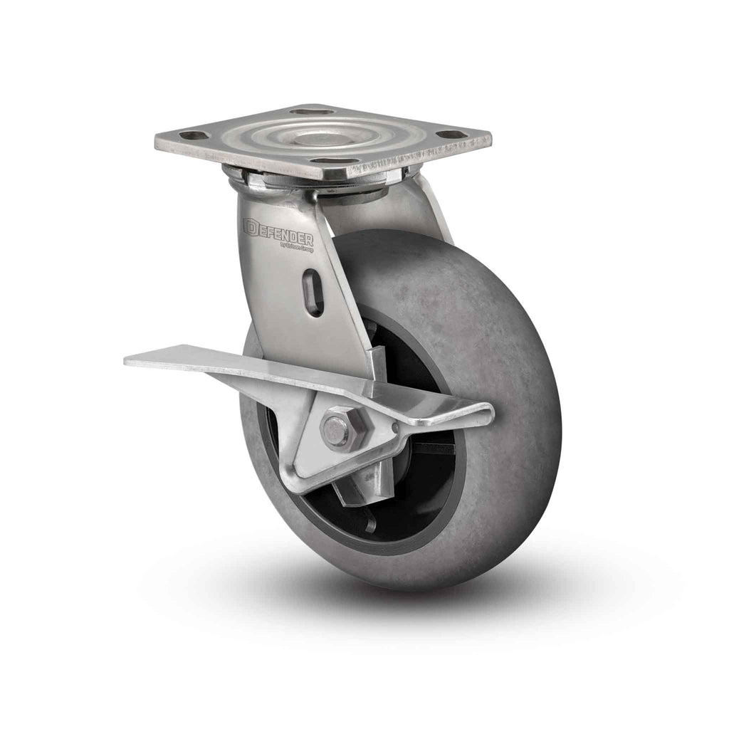 The Colson D4.06109.559 COND BRK3 SS WB29 swivel caster with Side Locking brake features a 6" x 2" Performa Rubber (Round/Conductive) wheel and a 4" x 4-1/2" Top Plate, capable of a 450 lb. capacity per caster. Complete caster specifications and downloadable CAD model are provided below. The Colson D4 Defender is the ideal 2” wide caster solution for customers requiring lasting performance and corrosion resistance. Manufactured from Type 304 stainless steel and polished, this series provides premium features and a critical defense to applications exposed to washdowns, cleaning agents, steam, caustic solutions, and other environmental conditions that eventually cause oxidation and failure in standard casters. From the standard FDA-approved performance food-grade grease, 3/4” permanent rivet kingpin, and top-performing wheels in the industry—including the Performa Rubber wheel—the Defender D4 will continue to perform through the toughest of elements.