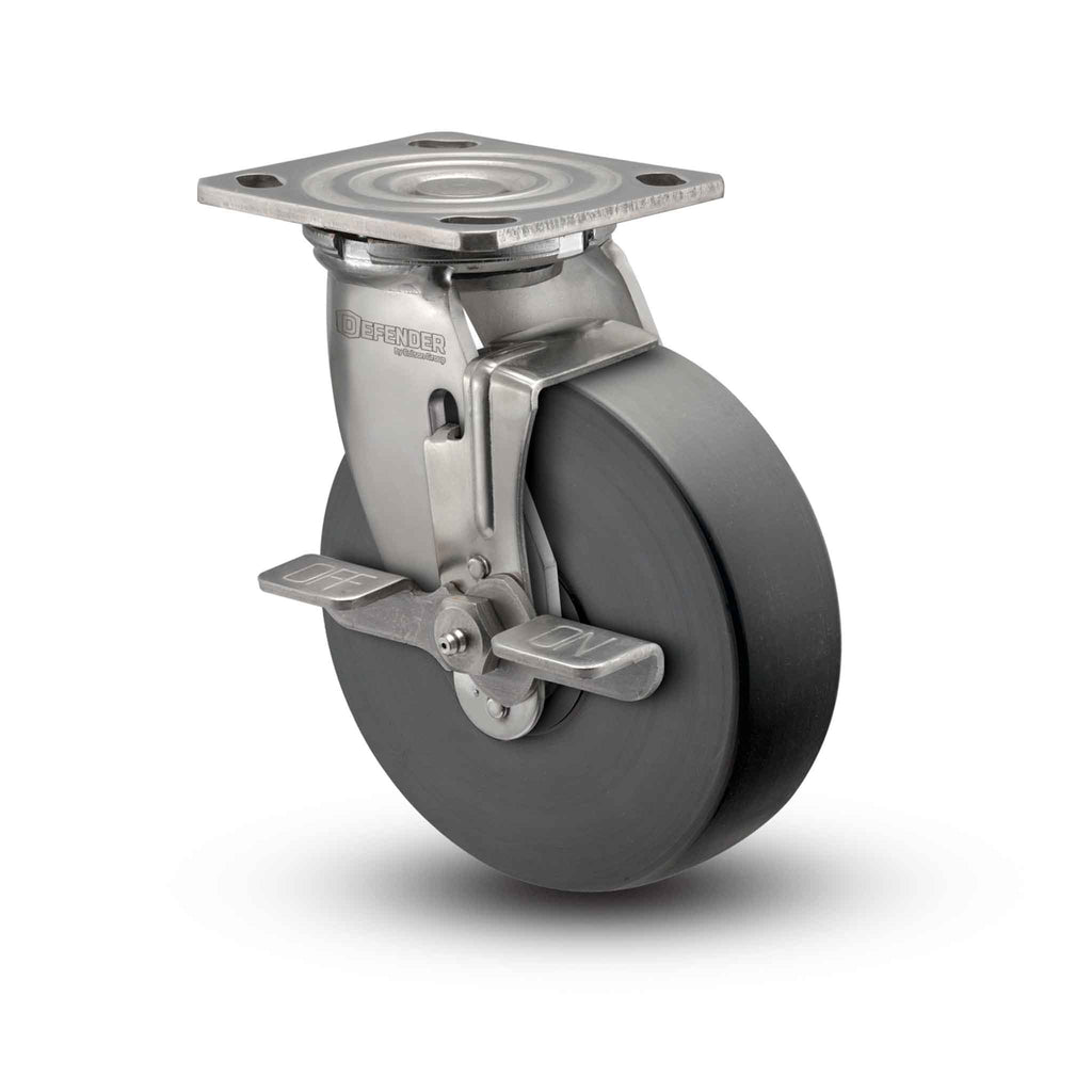 The Colson D4.08109.5PN BRK7 SS swivel caster with Side Locking brake features a 8" x 2" Commander HD wheel and a 4" x 4-1/2" Top Plate, capable of a 1250 lb. capacity per caster. Complete caster specifications and downloadable CAD model are provided below. The Colson D4 Defender is the ideal 2” wide caster solution for customers requiring lasting performance and corrosion resistance. Manufactured from Type 304 stainless steel and polished, this series provides premium features and a critical defense to applications exposed to washdowns, cleaning agents, steam, caustic solutions, and other environmental conditions that eventually cause oxidation and failure in standard casters. From the standard FDA-approved performance food-grade grease, 3/4” permanent rivet kingpin, and top-performing wheels in the industry—including the Performa Rubber wheel—the Defender D4 will continue to perform through the toughest of elements.