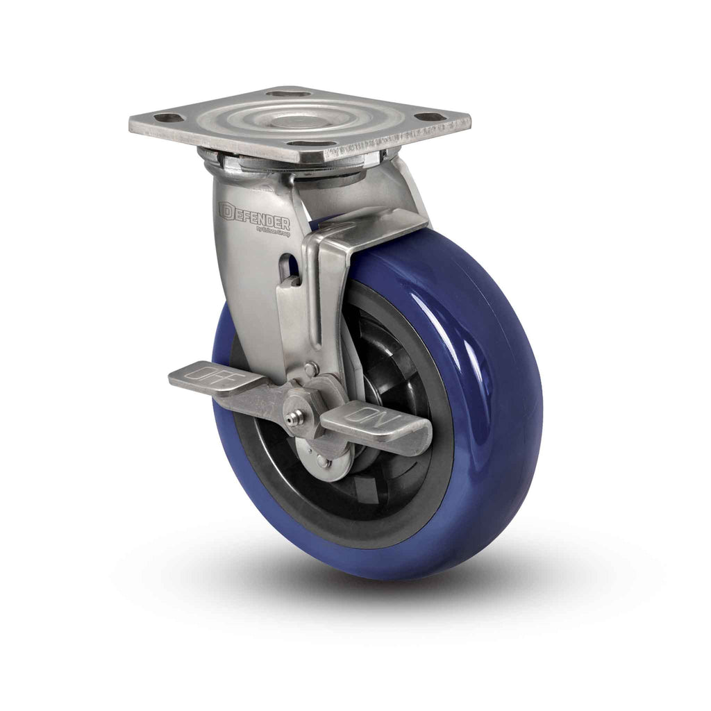 The Colson D4.08109.929 EG BRK7 SS WB29 swivel caster with Side Locking brake features a 8" x 2" Eagle Polyurethane wheel and a 4" x 4-1/2" Top Plate, capable of a 1200 lb. capacity per caster. Complete caster specifications and downloadable CAD model are provided below. The Colson D4 Defender is the ideal 2” wide caster solution for customers requiring lasting performance and corrosion resistance. Manufactured from Type 304 stainless steel and polished, this series provides premium features and a critical defense to applications exposed to washdowns, cleaning agents, steam, caustic solutions, and other environmental conditions that eventually cause oxidation and failure in standard casters. From the standard FDA-approved performance food-grade grease, 3/4” permanent rivet kingpin, and top-performing wheels in the industry—including the Performa Rubber wheel—the Defender D4 will continue to perform through the toughest of elements.