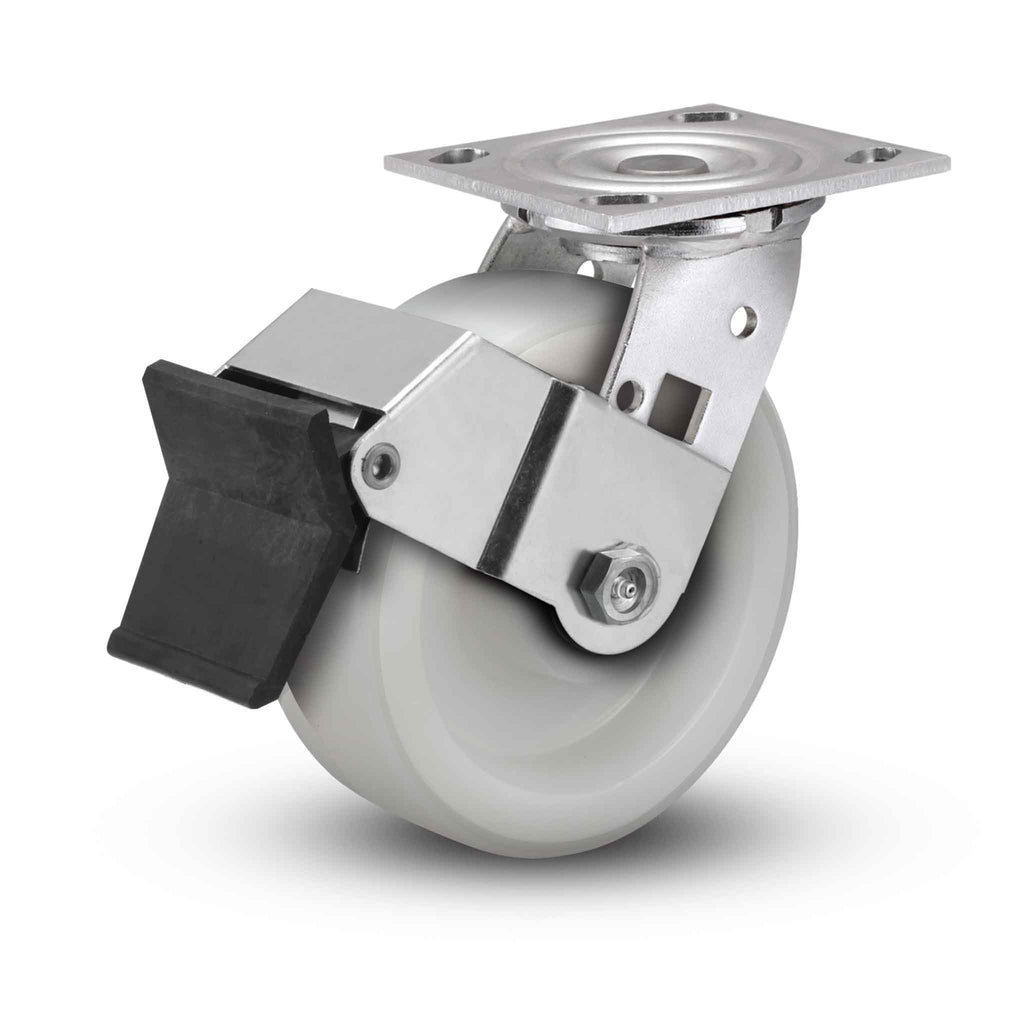 The Pemco SSES8X2WNYDWFB swivel caster with Top Wheel Lock brake features a 8" x 2" White Nylon wheel and a 4" x 4-1/2" Top Plate, capable of a 900 lb. capacity per caster. Complete caster specifications and downloadable CAD model are provided below. E-line Stainless Steel casters are ideal for harsh environments where frequent wash downs, chemicals, and other corrosive elements cause zinc-plated casters to rust or corrode. Featuring a more economical construction than our premium Defender D4 Series, this series has become a favorite entry-level stainless steel solution for many OEMs, fabricators, and caster replacement customers needing to prevent corrosion and rust. If you need more capacity or are dealing with more rugged applications, be sure to check out our stainless steel Defender D4 Series, 120 Kingpinless Series, or ultra-heavy duty 330 Kingpinless Series. E-line Stainless Steel features: