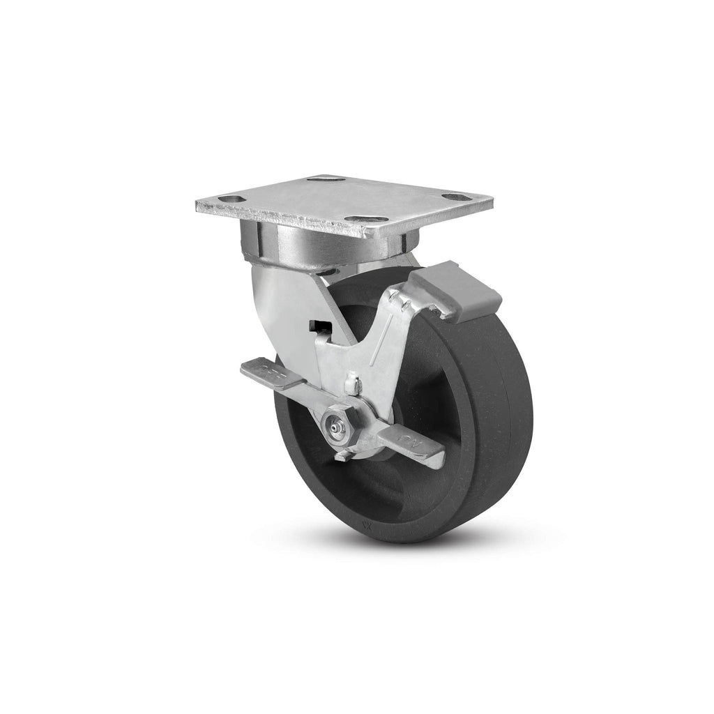 This 4" ergonomic heavy-duty swivel caster is engineered to deliver lasting performance in demanding industrial environments. Featuring an exclusive USA-made kingpinless rig with an extended lead, economical water/chemical resistant glass-filled-polyproylene wheel, and side activated brake – it helps reduce operator strain and improve safety when moving heavy carts and equipment.