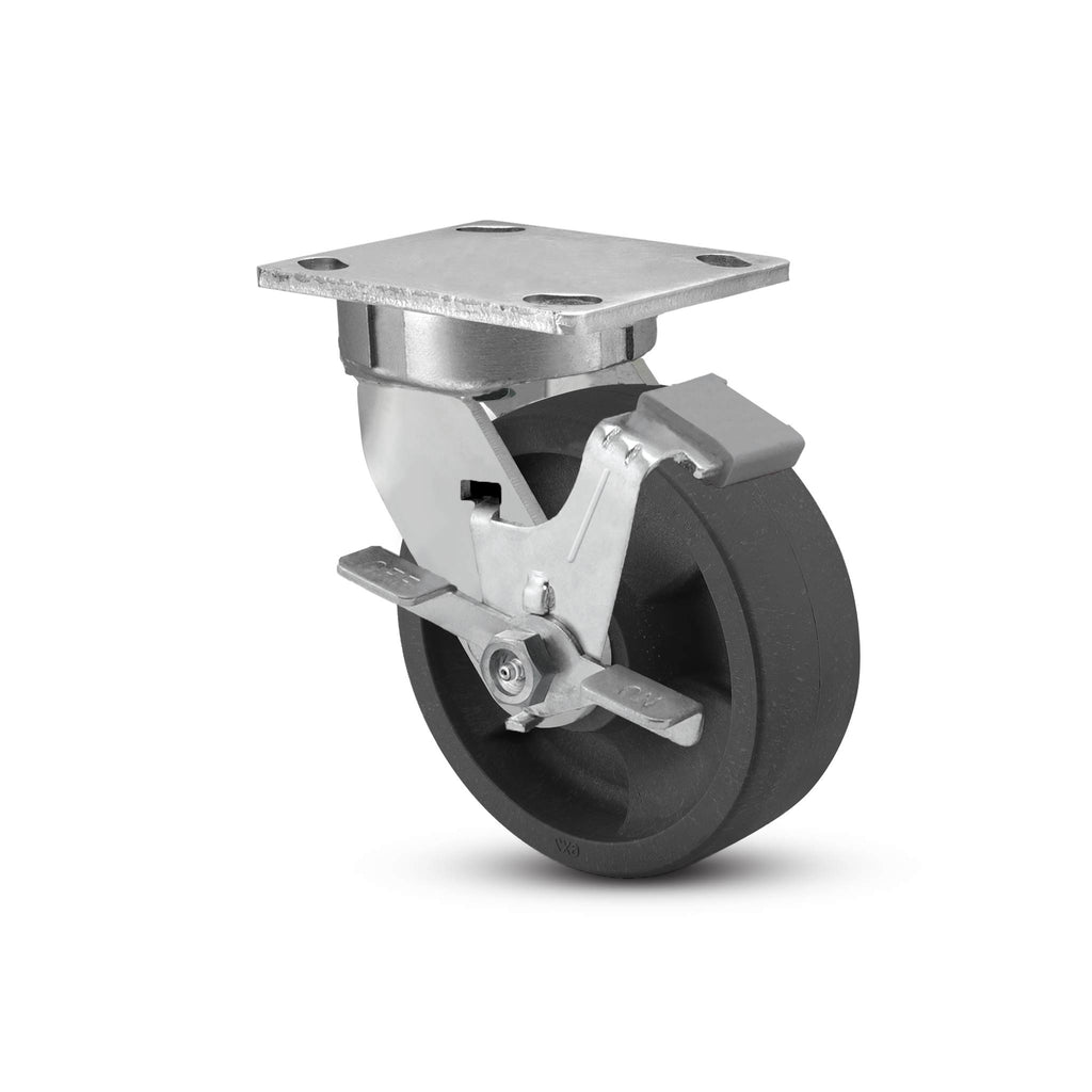 This 6" ergonomic heavy-duty swivel caster is engineered to deliver lasting performance in demanding industrial environments. Featuring an exclusive USA-made kingpinless rig with an extended lead, economical water/chemical resistant glass-filled-polyproylene wheel, and side activated brake – it helps reduce operator strain and improve safety when moving heavy carts and equipment.