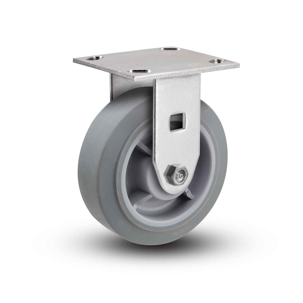 The Pemco SSER4X2TPRB rigid caster features a 4" x 2" Thermo-Rubber (Flat) wheel and a 4" x 4-1/2" Top Plate, capable of a 300 lb. capacity per caster. Complete caster specifications and downloadable CAD model are provided below. E-line Stainless Steel casters are ideal for harsh environments where frequent wash downs, chemicals, and other corrosive elements cause zinc-plated casters to rust or corrode. Featuring a more economical construction than our premium Defender D4 Series, this series has become a favorite entry-level stainless steel solution for many OEMs, fabricators, and caster replacement customers needing to prevent corrosion and rust. If you need more capacity or are dealing with more rugged applications, be sure to check out our stainless steel Defender D4 Series, 120 Kingpinless Series, or ultra-heavy duty 330 Kingpinless Series. E-line Stainless Steel features: