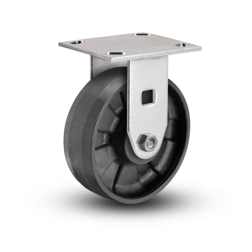 The Pemco SSER6X2MAXD rigid caster features a 6" x 2" Maxim Solid Fiberglass/Nylon wheel and a 4" x 4-1/2" Top Plate, capable of a 900 lb. capacity per caster. Complete caster specifications and downloadable CAD model are provided below. E-line Stainless Steel casters are ideal for harsh environments where frequent wash downs, chemicals, and other corrosive elements cause zinc-plated casters to rust or corrode. Featuring a more economical construction than our premium Defender D4 Series, this series has become a favorite entry-level stainless steel solution for many OEMs, fabricators, and caster replacement customers needing to prevent corrosion and rust. If you need more capacity or are dealing with more rugged applications, be sure to check out our stainless steel Defender D4 Series, 120 Kingpinless Series, or ultra-heavy duty 330 Kingpinless Series. E-line Stainless Steel features: