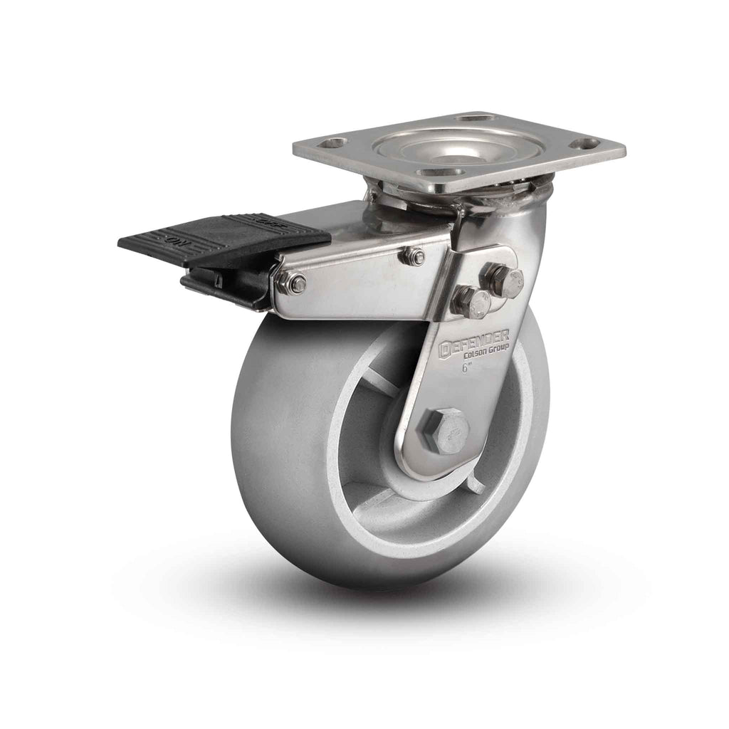 The Colson D4.05109.559 BRK4 SS WB29 swivel caster with Top Total Lock brake features a 5" x 2" Performa Rubber (Round) wheel and a 4" x 4-1/2" Top Plate, capable of a 425 lb. capacity per caster. Complete caster specifications and downloadable CAD model are provided below. The Colson D4 Defender is the ideal 2” wide caster solution for customers requiring lasting performance and corrosion resistance. Manufactured from Type 304 stainless steel and polished, this series provides premium features and a critical defense to applications exposed to washdowns, cleaning agents, steam, caustic solutions, and other environmental conditions that eventually cause oxidation and failure in standard casters. From the standard FDA-approved performance food-grade grease, 3/4” permanent rivet kingpin, and top-performing wheels in the industry—including the Performa Rubber wheel—the Defender D4 will continue to perform through the toughest of elements.