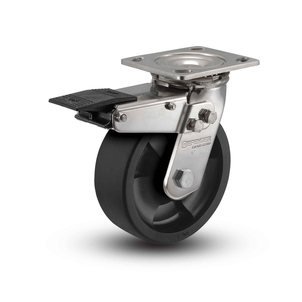 The Colson D4.05109.839 HTBLK BRK4 SS WB29 swivel caster with Top Total Lock brake features a 5" x 2" Hi-Temp Nylon Glass Filled wheel and a 4" x 4-1/2" Top Plate, capable of a 1000 lb. capacity per caster. Complete caster specifications and downloadable CAD model are provided below. The Colson D4 Defender is the ideal 2” wide caster solution for customers requiring lasting performance and corrosion resistance. Manufactured from Type 304 stainless steel and polished, this series provides premium features and a critical defense to applications exposed to washdowns, cleaning agents, steam, caustic solutions, and other environmental conditions that eventually cause oxidation and failure in standard casters. From the standard FDA-approved performance food-grade grease, 3/4” permanent rivet kingpin, and top-performing wheels in the industry—including the Performa Rubber wheel—the Defender D4 will continue to perform through the toughest of elements.