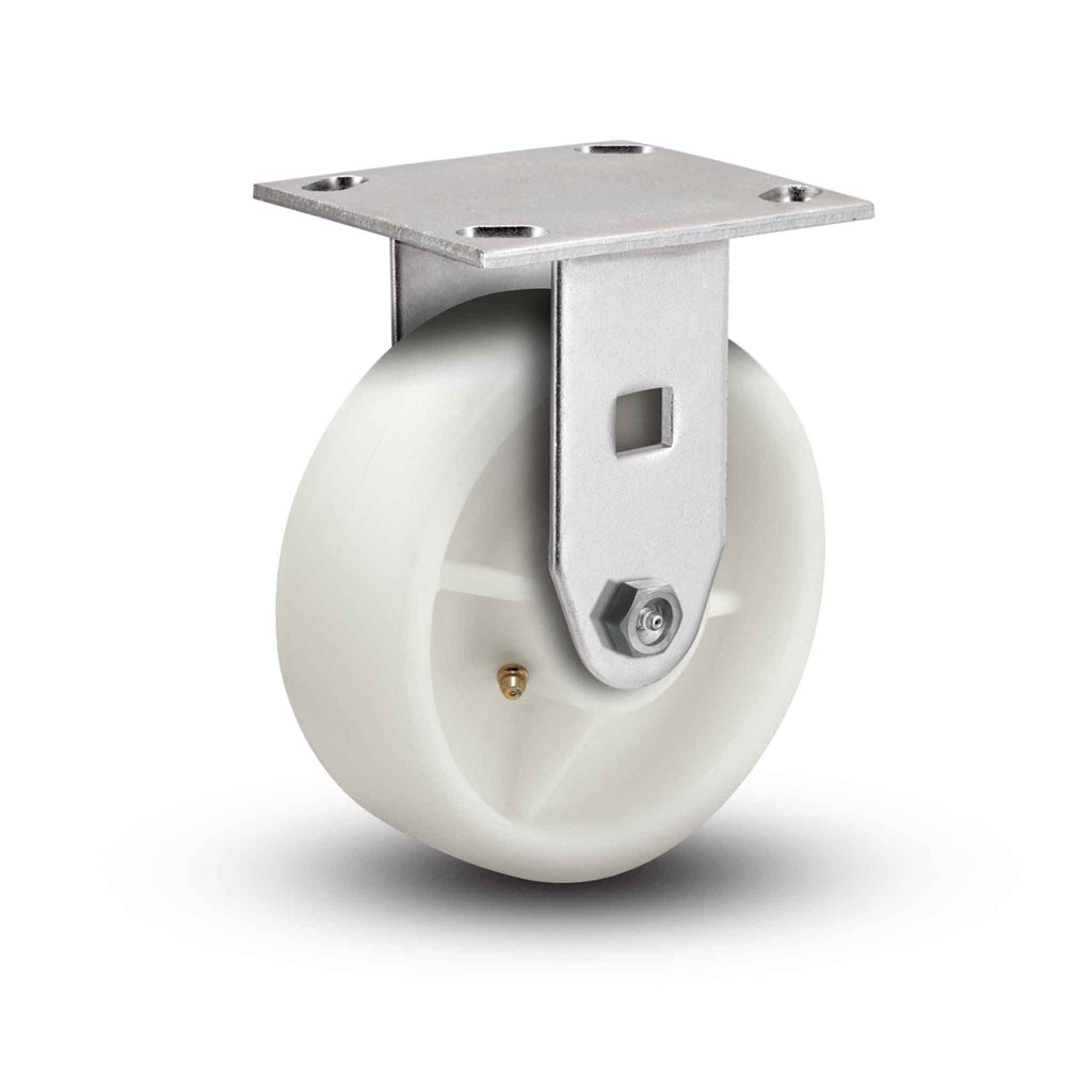 The Pemco SSER6X2WNY rigid caster features a 6" x 2" White Nylon wheel and a 4" x 4-1/2" Top Plate, capable of a 900 lb. capacity per caster. Complete caster specifications and downloadable CAD model are provided below. E-line Stainless Steel casters are ideal for harsh environments where frequent wash downs, chemicals, and other corrosive elements cause zinc-plated casters to rust or corrode. Featuring a more economical construction than our premium Defender D4 Series, this series has become a favorite entry-level stainless steel solution for many OEMs, fabricators, and caster replacement customers needing to prevent corrosion and rust. If you need more capacity or are dealing with more rugged applications, be sure to check out our stainless steel Defender D4 Series, 120 Kingpinless Series, or ultra-heavy duty 330 Kingpinless Series. E-line Stainless Steel features: