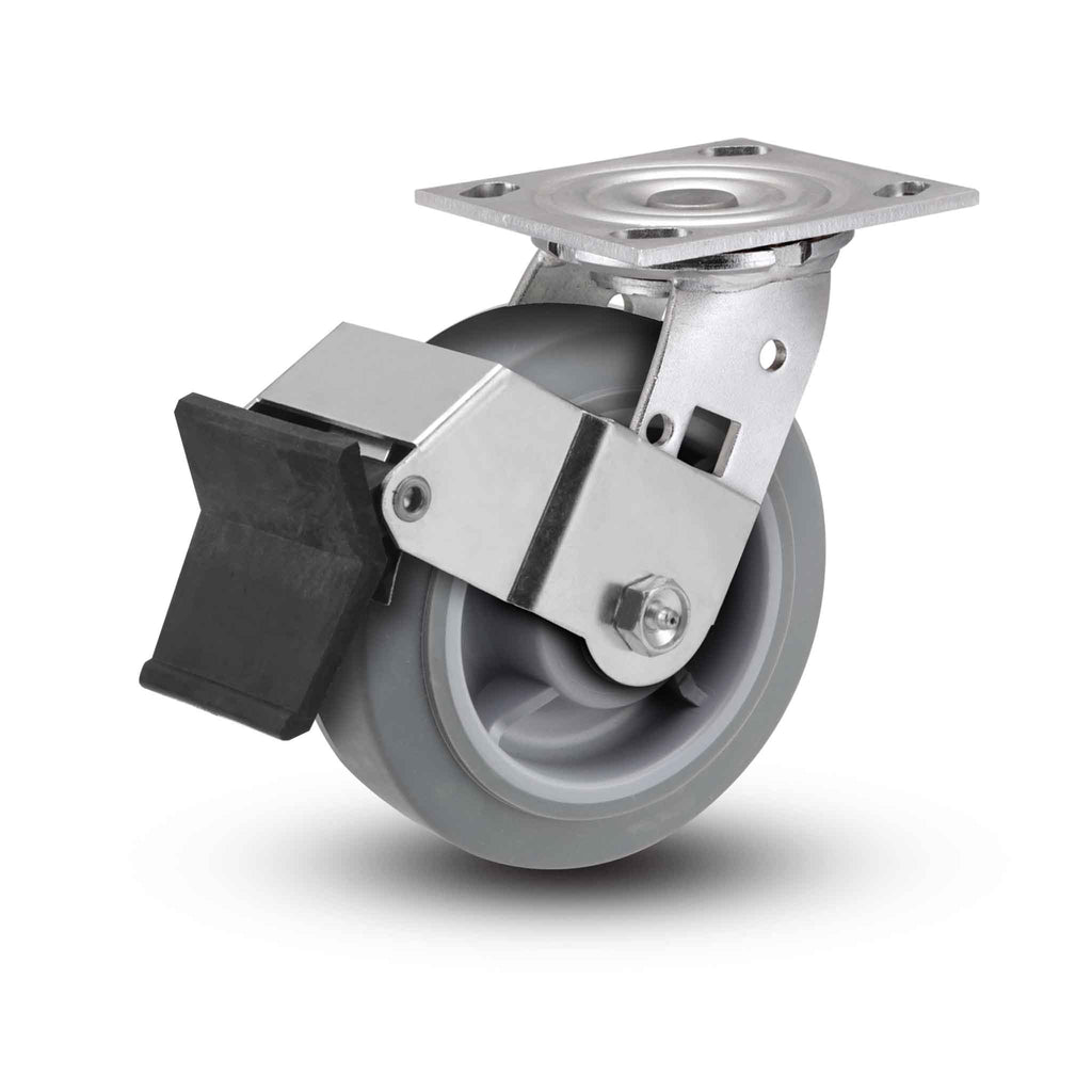 The Pemco SSES6X2TPRBWFB swivel caster with Top Wheel Lock brake features a 6" x 2" Thermo-Rubber (Flat) wheel and a 4" x 4-1/2" Top Plate, capable of a 500 lb. capacity per caster. Complete caster specifications and downloadable CAD model are provided below. E-line Stainless Steel casters are ideal for harsh environments where frequent wash downs, chemicals, and other corrosive elements cause zinc-plated casters to rust or corrode. Featuring a more economical construction than our premium Defender D4 Series, this series has become a favorite entry-level stainless steel solution for many OEMs, fabricators, and caster replacement customers needing to prevent corrosion and rust. If you need more capacity or are dealing with more rugged applications, be sure to check out our stainless steel Defender D4 Series, 120 Kingpinless Series, or ultra-heavy duty 330 Kingpinless Series. E-line Stainless Steel features: