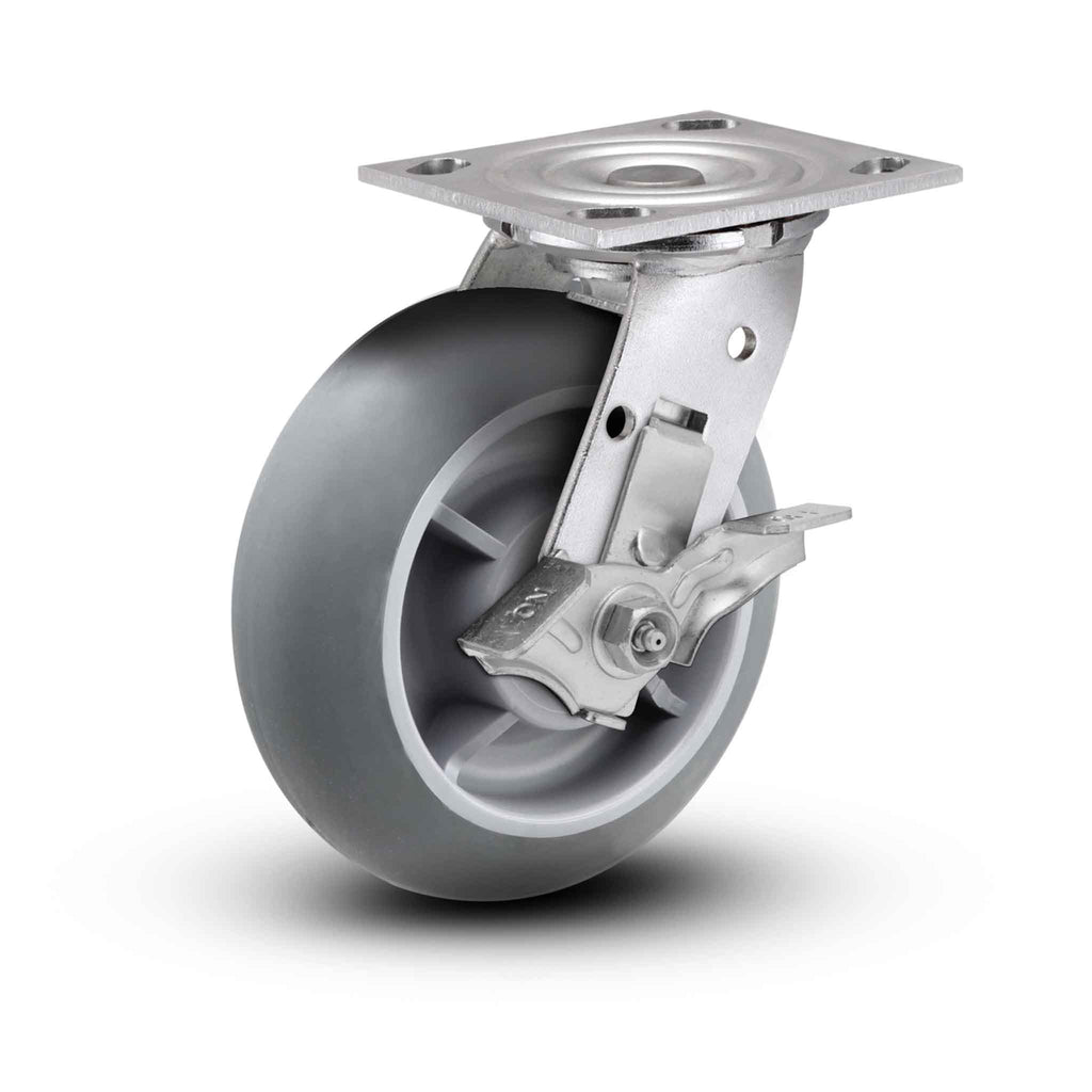 The Pemco SSES8X2TPDDTBK swivel caster with Side Locking brake features a 8" x 2" Thermo-Rubber (Donut) wheel and a 4" x 4-1/2" Top Plate, capable of a 600 lb. capacity per caster. Complete caster specifications and downloadable CAD model are provided below. E-line Stainless Steel casters are ideal for harsh environments where frequent wash downs, chemicals, and other corrosive elements cause zinc-plated casters to rust or corrode. Featuring a more economical construction than our premium Defender D4 Series, this series has become a favorite entry-level stainless steel solution for many OEMs, fabricators, and caster replacement customers needing to prevent corrosion and rust. If you need more capacity or are dealing with more rugged applications, be sure to check out our stainless steel Defender D4 Series, 120 Kingpinless Series, or ultra-heavy duty 330 Kingpinless Series. E-line Stainless Steel features: