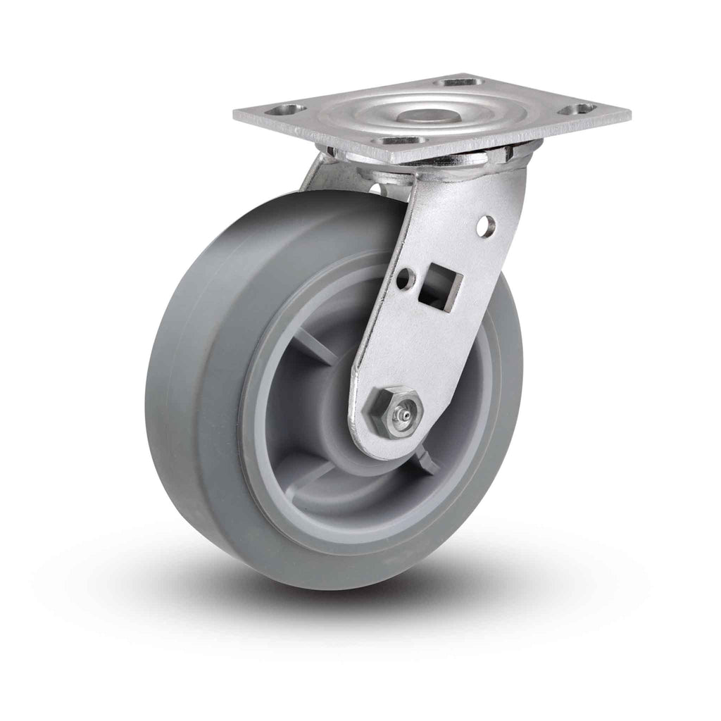 The Pemco SSES8X2TPR swivel caster features a 8" x 2" Thermo-Rubber (Flat) wheel and a 4" x 4-1/2" Top Plate, capable of a 600 lb. capacity per caster. Complete caster specifications and downloadable CAD model are provided below. E-line Stainless Steel casters are ideal for harsh environments where frequent wash downs, chemicals, and other corrosive elements cause zinc-plated casters to rust or corrode. Featuring a more economical construction than our premium Defender D4 Series, this series has become a favorite entry-level stainless steel solution for many OEMs, fabricators, and caster replacement customers needing to prevent corrosion and rust. If you need more capacity or are dealing with more rugged applications, be sure to check out our stainless steel Defender D4 Series, 120 Kingpinless Series, or ultra-heavy duty 330 Kingpinless Series. E-line Stainless Steel features: