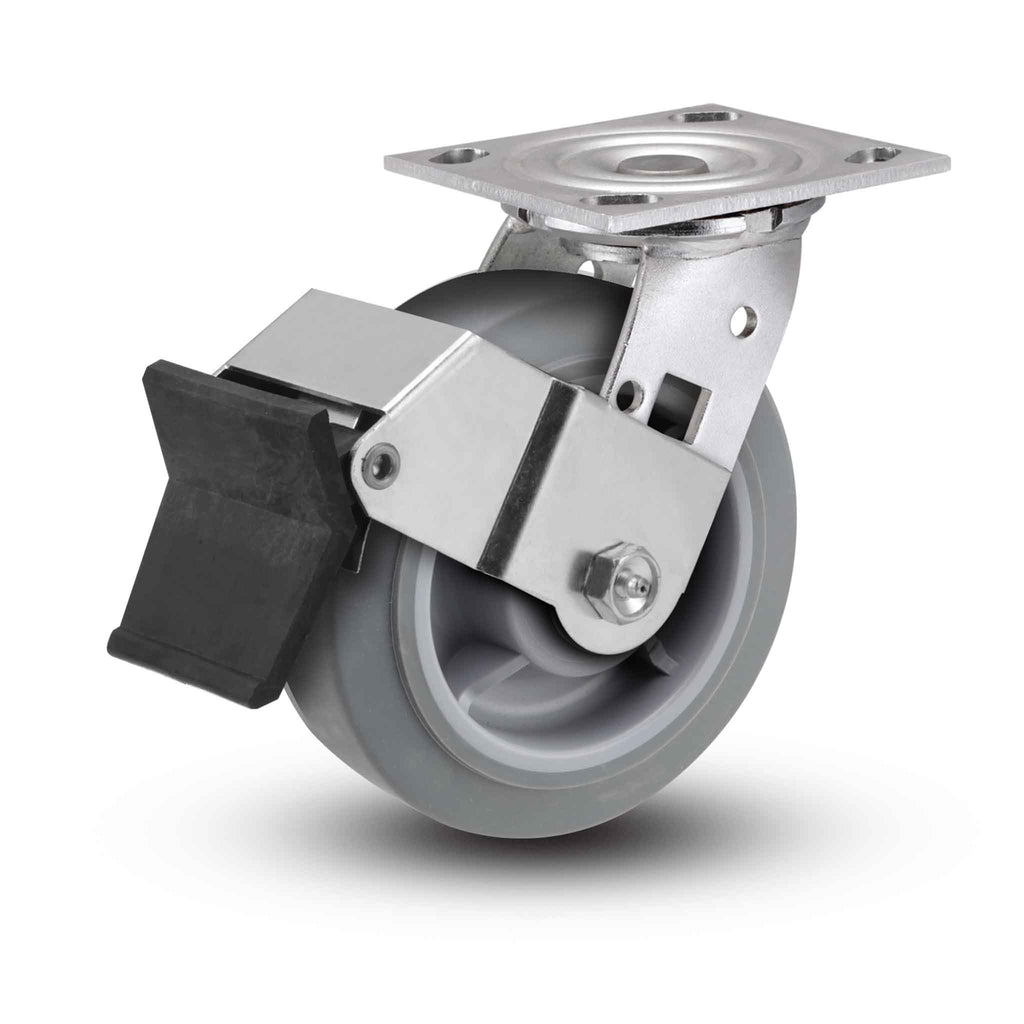 The Pemco SSES8X2TPRBWFB swivel caster with Top Wheel Lock brake features a 8" x 2" Thermo-Rubber (Flat) wheel and a 4" x 4-1/2" Top Plate, capable of a 600 lb. capacity per caster. Complete caster specifications and downloadable CAD model are provided below. E-line Stainless Steel casters are ideal for harsh environments where frequent wash downs, chemicals, and other corrosive elements cause zinc-plated casters to rust or corrode. Featuring a more economical construction than our premium Defender D4 Series, this series has become a favorite entry-level stainless steel solution for many OEMs, fabricators, and caster replacement customers needing to prevent corrosion and rust. If you need more capacity or are dealing with more rugged applications, be sure to check out our stainless steel Defender D4 Series, 120 Kingpinless Series, or ultra-heavy duty 330 Kingpinless Series. E-line Stainless Steel features: