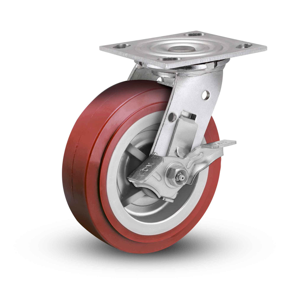 The Pemco SSES8X2TUMBTBK swivel caster with Side Locking brake features a 4" x 2" Thermo-Urethane maroon wheel and a 4" x 4-1/2" Top Plate, capable of a 800 lb. capacity per caster. Complete caster specifications and downloadable CAD model are provided below. E-line Stainless Steel casters are ideal for harsh environments where frequent wash downs, chemicals, and other corrosive elements cause zinc-plated casters to rust or corrode. Featuring a more economical construction than our premium Defender D4 Series, this series has become a favorite entry-level stainless steel solution for many OEMs, fabricators, and caster replacement customers needing to prevent corrosion and rust. If you need more capacity or are dealing with more rugged applications, be sure to check out our stainless steel Defender D4 Series, 120 Kingpinless Series, or ultra-heavy duty 330 Kingpinless Series. E-line Stainless Steel features: