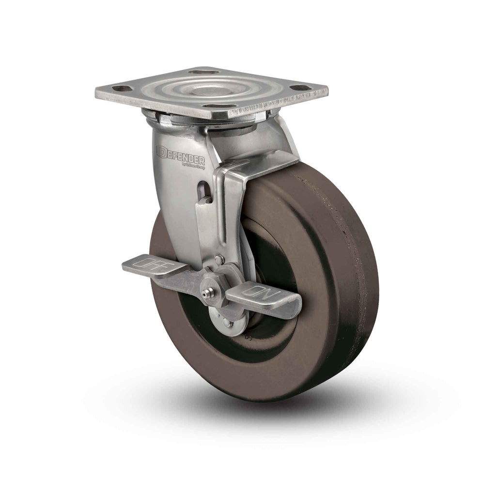 The Colson D4.06109.339 HT BRK7 SS WB29 swivel caster with Side Locking brake features a 6" x 2" Phenolic - Hi-Temp wheel and a 4" x 4-1/2" Top Plate, capable of a 1200 lb. capacity per caster. Complete caster specifications and downloadable CAD model are provided below. The Colson D4 Defender is the ideal 2” wide caster solution for customers requiring lasting performance and corrosion resistance. Manufactured from Type 304 stainless steel and polished, this series provides premium features and a critical defense to applications exposed to washdowns, cleaning agents, steam, caustic solutions, and other environmental conditions that eventually cause oxidation and failure in standard casters. From the standard FDA-approved performance food-grade grease, 3/4” permanent rivet kingpin, and top-performing wheels in the industry—including the Performa Rubber wheel—the Defender D4 will continue to perform through the toughest of elements.