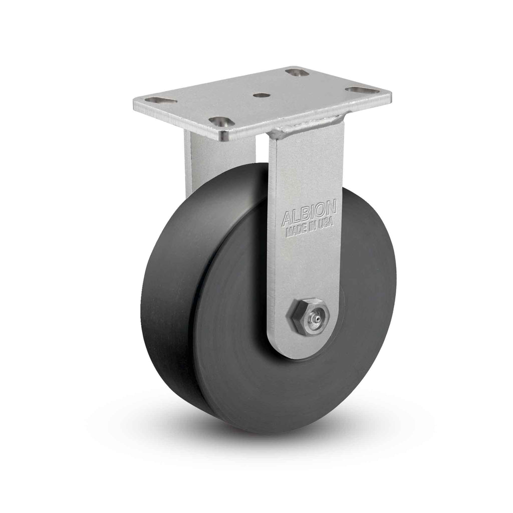 The heavy-duty Albion 310NX10528R rigid caster features a 10" x 3" wide Trionix wheel and a 6-1/4'' x 4-1/2'' top plate, capable of a 4100 lb. capacity per caster. Complete caster specifications and downloadable CAD model are provided below. This USA-made series is a 3” wide-wheel workhorse designed to handle shock and impact. Constructed from high-quality, heat-treated AISI 1045 laser-cut steel, this series provides trusted performance. Precision machined raceway, fully welded legs (inside and outside), and kingpinless design delivers superior strength in rugged applications. This series also supports towed applications, contact us prior to ordering to ensure your selection meets your towing requirements.
