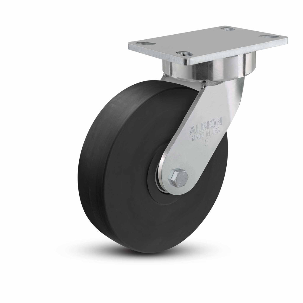 38NX08228S01 is a 8" x 2" wide wheel swivel caster with a Heavy-Duty Nylon Wheel and 6-1/4'' x 4-1/2'' top plate designed and constructed for highly ergonomic, durable, and quiet operation. Featuring a USA-made rig with a sealed-precision-ball-bearing raceway and extended lead, this caster provides effortless mobility and is extremely quiet, providing a safer working environment for your employees. The caster requires no maintenance for life, featuring sealed precision ball bearings in wheel and swivel section (for swivel models). A robust 5/16" HSLA top plate and 1/4" steel leg construction with fully welded legs (welded inside and outside to yoke base) allow these highly ergonomic casters to perform at higher load capacities than traditional casters, even with the extended lead – which helps smoothly and easily align the casters when turning while also reducing unwanted chatter from towed or faster moving equipment. The heavy-duty and industrial machined Trionix high-impact polymer nylon wheel (78-82 Shore D hardness) delivers superior rollability, strength, and slide resistance. It is an ideal replacement for metal wheels, as they can handle the same capacities but provide excellent floor protection and are resistant to corrosion and most chemicals. A slight crown and sealed precision ball bearings allow these durable wheels to move with ease and precision (black finish, handling temperatures from -30°F to 220°F). This maintenance-free and ergonomic series also features:
