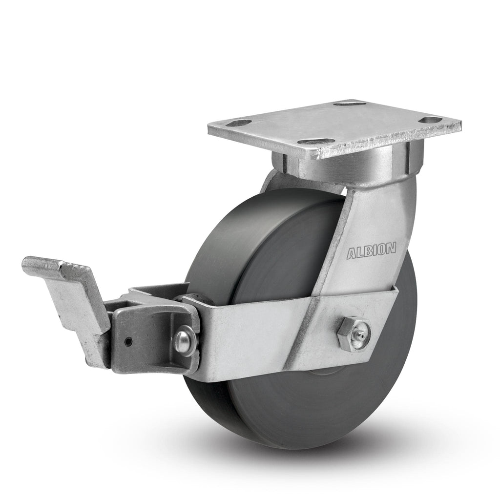 The Albion 110NX05228SFBB swivel caster with Top Wheel Lock brake features a 5" x 2" wide wheel and a 4 1/2" x 4" top plate, capable of a 2000 lb. capacity per caster. Complete caster specifications and downloadable CAD model are provided below. This trusted kingpinless series features a precision machined large raceway, 5/16" thick AISI 1045 steel top plate, and fully heat-treated construction, making it an the ideal solution for applications exposed to rugged conditions or high amounts of impact and shock. More durable than competitors’ case or induction hardened construction, and longer lasting than conventional kingpin designs. Kingpinless heavy-duty casters are built to handle shock and impact better than traditional kingpin casters, as it eliminates the most common area of caster failure in rugged applications: the kingpin (which can get strained and stretched due to the impact or shock load).
