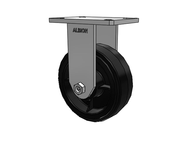 The Albion 470MR08501R rigid caster features a 8" x 3" wide wheel and a 7 1/4" x 5 1/4" top plate, capable of a 900 lb. capacity per caster. Complete caster specifications and downloadable CAD model are provided below. Ideal for applications that are on the border of exceeding 2” wide safety factors, or where a premium 3” wide caster may be overkill for the application or budget. This series provides the next step in a trusted, economical solution. Be sure to also review our premium 3” wide 76 Series featuring a 3-year warranty, USA-made rigs, higher load capacities, and higher performance wheels. The 470 Series also supports towed applications, contact us prior to ordering to ensure your selection meets your towing requirements.
