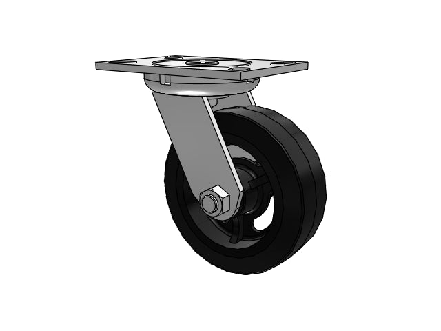 The Albion 62MR06201S swivel caster features a 6" x 2" wide wheel and a 6-1/4'' x 4-1/2'' top plate, capable of a 500 lb. capacity per caster. Complete caster specifications and downloadable CAD model are provided below. Manufactured from cold-formed steel, this popular 2” wide wheel series features a 6.25” x 4.5” top plate and heat-treated king bolt and nut, ensuring durability and a longer caster life.