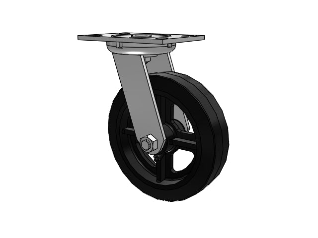 The Albion 62MR08201S swivel caster features a 8" x 2" wide wheel and a 6-1/4'' x 4-1/2'' top plate, capable of a 600 lb. capacity per caster. Complete caster specifications and downloadable CAD model are provided below. Manufactured from cold-formed steel, this popular 2” wide wheel series features a 6.25” x 4.5” top plate and heat-treated king bolt and nut, ensuring durability and a longer caster life.