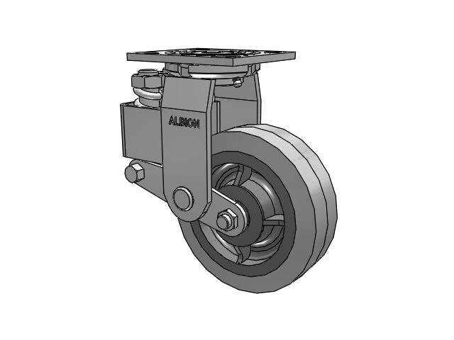 The Albion 40XS06201S swivel caster features a 6" x 2" wide wheel and a 4-1/2" x 4" top plate, capable of a 500 lb. capacity per caster. Complete caster specifications and downloadable CAD model are provided below. Designed with cargo protection and noise mitigation in mind, this spring-loaded caster series protects loads from damaging shocks or unwanted vibration and movement. Noise levels are also reduced through the dampening effect of these casters.