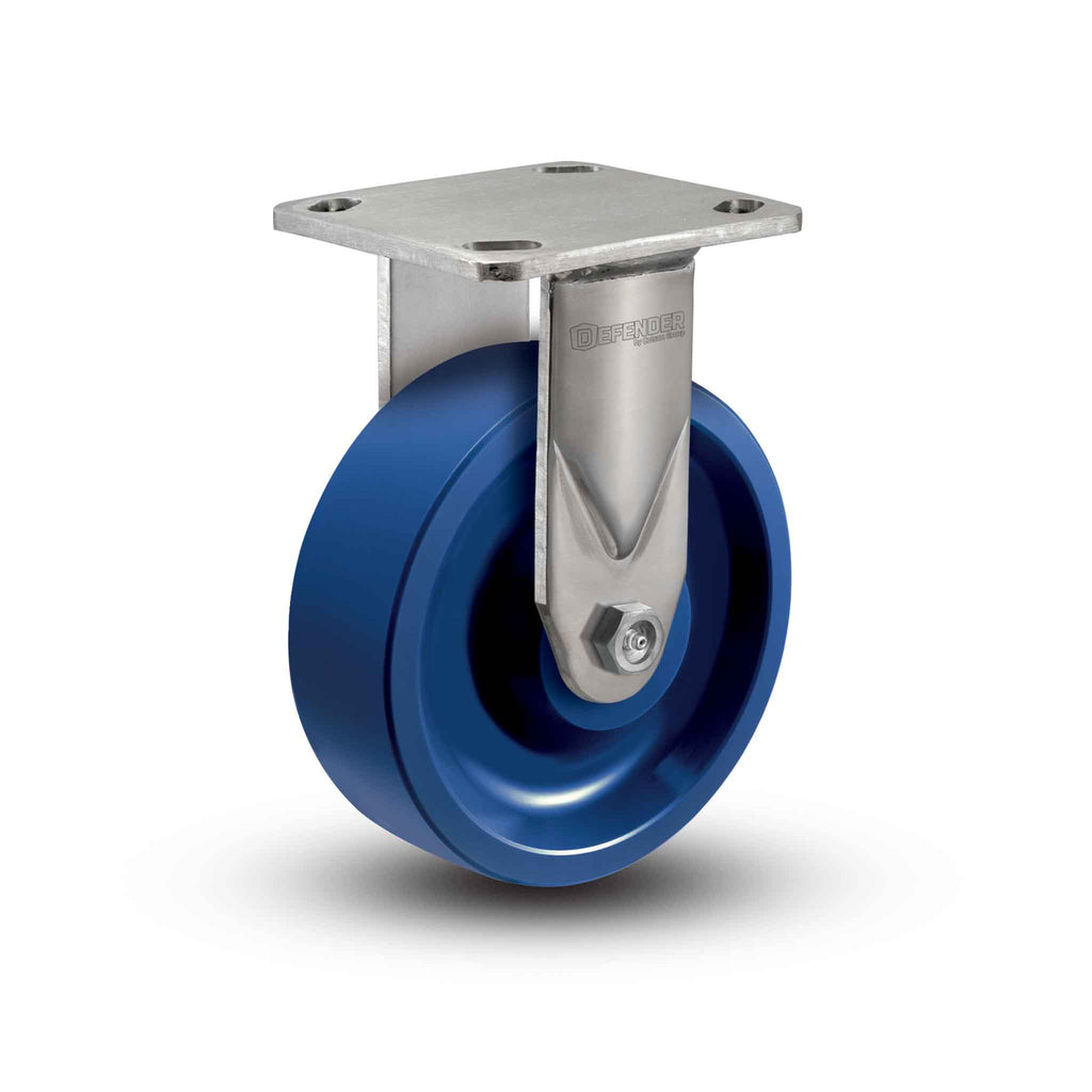 The Colson D4.06108.931 KW SS rigid caster features a 6" x 2" K Solid Polyurethane wheel and a 4" x 4-1/2" Top Plate, capable of a 1250 lb. capacity per caster. Complete caster specifications and downloadable CAD model are provided below. The Colson D4 Defender is the ideal 2” wide caster solution for customers requiring lasting performance and corrosion resistance. Manufactured from Type 304 stainless steel and polished, this series provides premium features and a critical defense to applications exposed to washdowns, cleaning agents, steam, caustic solutions, and other environmental conditions that eventually cause oxidation and failure in standard casters. From the standard FDA-approved performance food-grade grease, 3/4” permanent rivet kingpin, and top-performing wheels in the industry—including the Performa Rubber wheel—the Defender D4 will continue to perform through the toughest of elements.