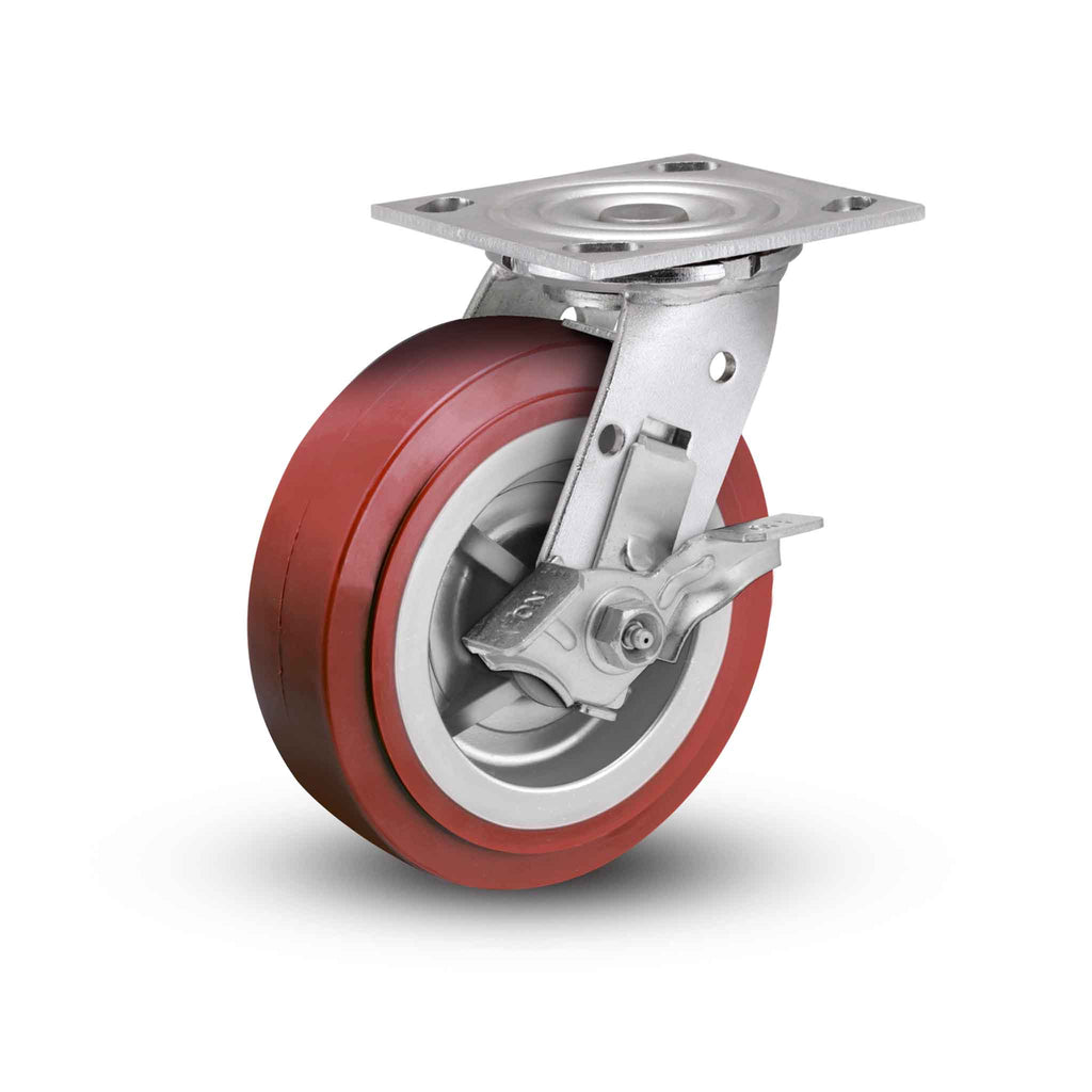The Pemco SSES5X2TUMDTBK swivel caster with Side Locking brake features a 4" x 2" Thermo-Urethane maroon wheel and a 4" x 4-1/2" Top Plate, capable of a 600 lb. capacity per caster. Complete caster specifications and downloadable CAD model are provided below. E-line Stainless Steel casters are ideal for harsh environments where frequent wash downs, chemicals, and other corrosive elements cause zinc-plated casters to rust or corrode. Featuring a more economical construction than our premium Defender D4 Series, this series has become a favorite entry-level stainless steel solution for many OEMs, fabricators, and caster replacement customers needing to prevent corrosion and rust. If you need more capacity or are dealing with more rugged applications, be sure to check out our stainless steel Defender D4 Series, 120 Kingpinless Series, or ultra-heavy duty 330 Kingpinless Series. E-line Stainless Steel features: