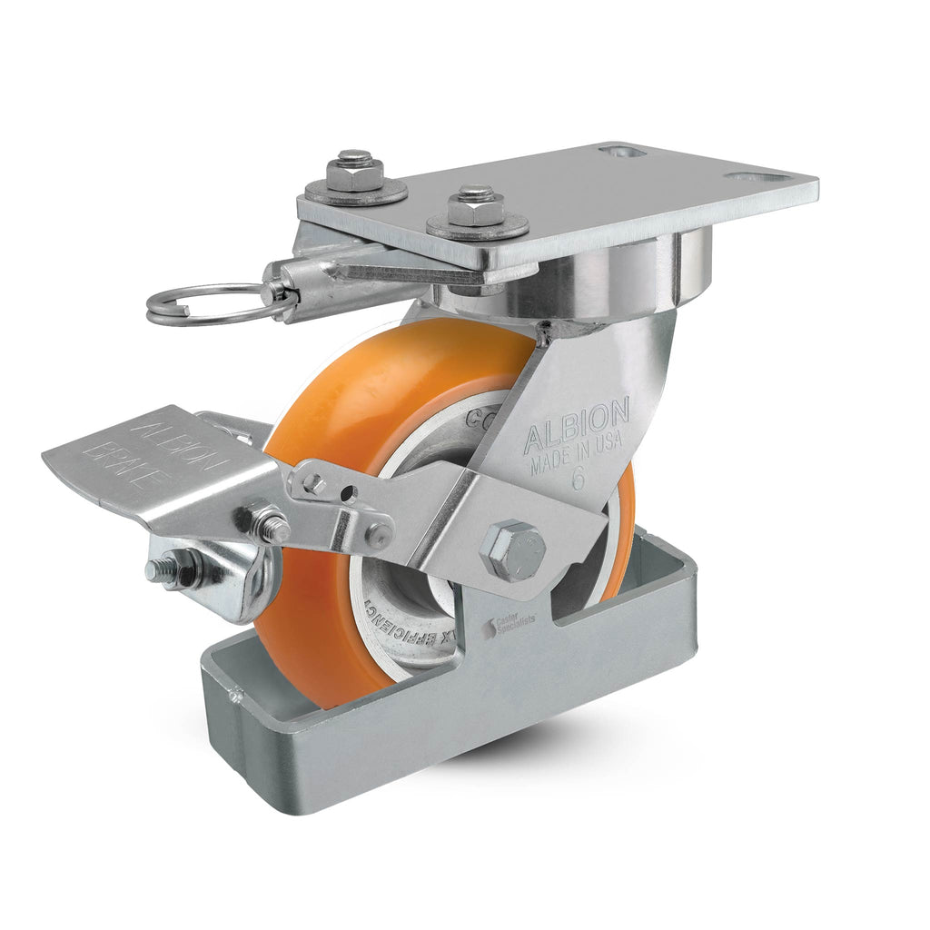 The 6"x2" Albion 38AN06228SLFBKTO swivel plate caster is built for demanding industrial environments—delivering best-in-class ergonomic performance and unmatched durability for towed or manually moved equipment. Featuring the Orange MAX-Efficiency polyurethane-on-aluminum wheel, this caster outlasts the leading competitor by up to 2x in independent testing and provides up to 26% easier movement for operators. Paired with a USA-made, maintenance-free rig and 4-position swivel lock, it is designed to reduce injury risks, lower lifetime maintenance costs, and give operators precise directional control when needed.