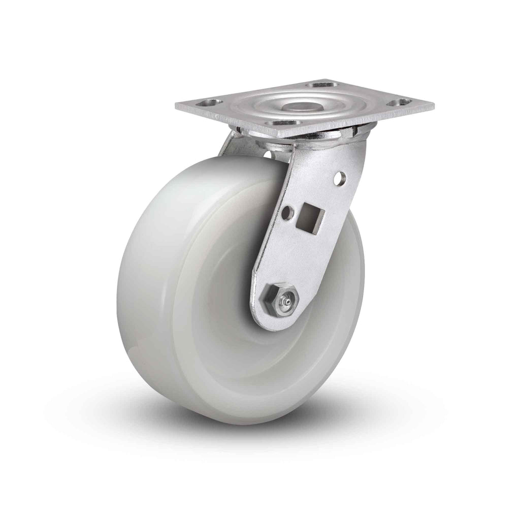 The Pemco SSES4X2WNYB swivel caster features a 4" x 2" White Nylon wheel and a 4" x 4-1/2" Top Plate, capable of a 900 lb. capacity per caster. Complete caster specifications and downloadable CAD model are provided below. E-line Stainless Steel casters are ideal for harsh environments where frequent wash downs, chemicals, and other corrosive elements cause zinc-plated casters to rust or corrode. Featuring a more economical construction than our premium Defender D4 Series, this series has become a favorite entry-level stainless steel solution for many OEMs, fabricators, and caster replacement customers needing to prevent corrosion and rust. If you need more capacity or are dealing with more rugged applications, be sure to check out our stainless steel Defender D4 Series, 120 Kingpinless Series, or ultra-heavy duty 330 Kingpinless Series. E-line Stainless Steel features: