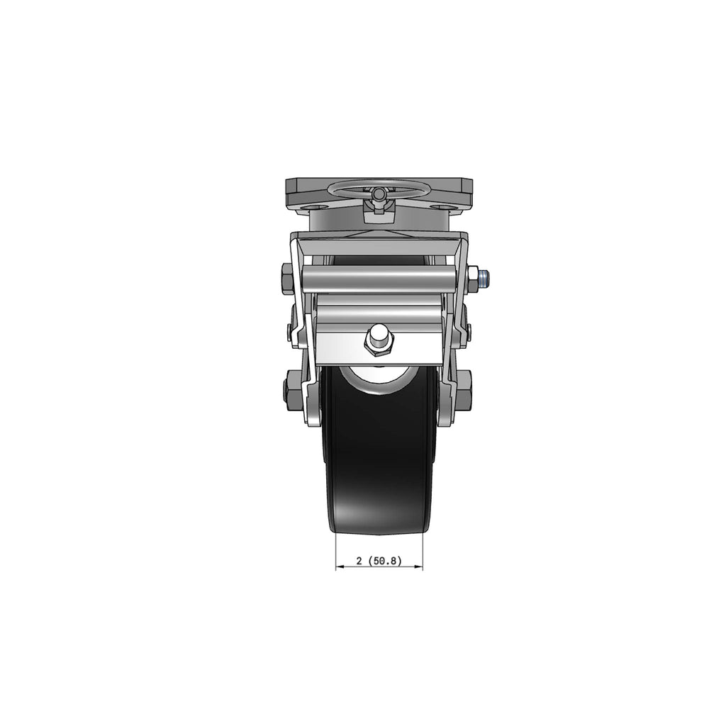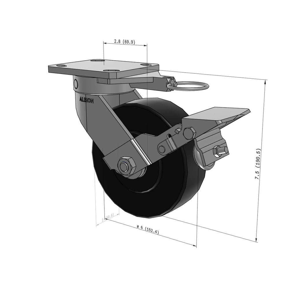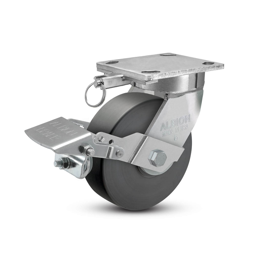 This 6" ergonomic heavy-duty swivel caster is engineered to deliver lasting performance in demanding industrial environments. Featuring an exclusive USA-made kingpinless rig with an extended lead, high-impact Nylatron NX wheel, secure metal face brake, and swivel lock – it helps reduce operator strain and improve safety when moving heavy carts and equipment.