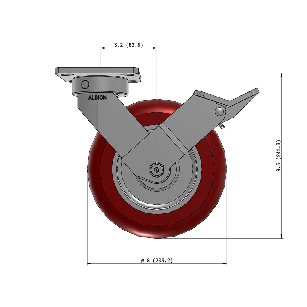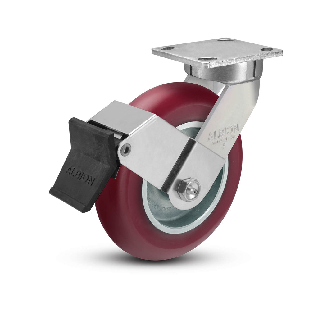 This 8" ergonomic heavy-duty swivel caster is engineered to deliver lasting performance in demanding industrial environments. Featuring an exclusive USA-made kingpinless rig with an extended lead, advanced maroon MAX-Efficiency polyurethane wheel, and face brake – it helps reduce operator strain and improve safety when moving heavy carts and equipment.