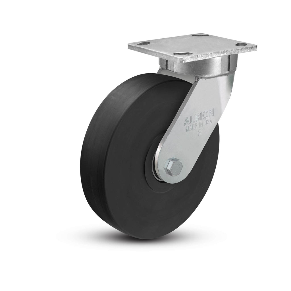 This 8" ergonomic heavy-duty swivel caster is engineered to deliver lasting performance in demanding industrial environments. Featuring an exclusive USA-made kingpinless rig with an extended lead and high-impact Nylatron NX wheel – it helps reduce operator strain and improve safety when moving heavy carts and equipment.