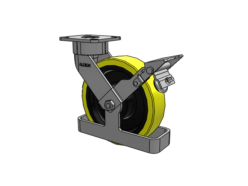 28PF08228S01FBKTO is a 8" x 2" wide wheel brake caster with a heavy-duty Polyurethane-on-Iron wheel and 4-1/2" x 4'' top plate designed and constructed for highly ergonomic and quiet operation. Featuring a USA-made rig with a sealed-precision-ball-bearing raceway and extended lead, this caster provides effortless mobility and is extremely quiet, providing a safer working environment for your employees. The caster requires no maintenance for life, featuring sealed precision ball bearings in wheel and swivel section (for swivel models). 1/4" steel construction with fully welded legs (welded inside and outside to yoke base) allow these highly ergonomic casters to perform at higher load capacities than traditional casters, even with the extended lead – which helps smoothly and easily align the casters when turning while also reducing unwanted chatter from towed or faster moving equipment. The heavy-duty and ergonomic polyurethane wheel tread is securely bonded to a precision machined and heavy-duty cast iron core, featuring precision ball bearings for smooth and reliable mobility under both manual and heavy towed applications (95 Shore A hardness with radius tread). The included face brake provides easy to engage positive braking action against the wheel face, ensuring a solid lock. The provided toe guard helps to protect toes and other debris from being ran over and is cleanly integrated into the laser cut legs. This maintenance-free and ergonomic series also features: