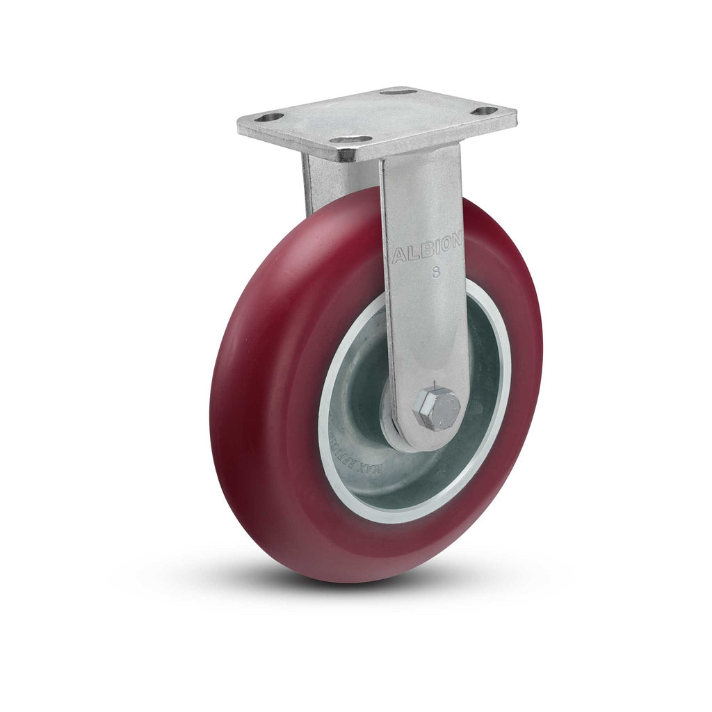 28AX08228R01 is a 8" x 2" wide wheel rigid caster with a Maroon MAX-Efficiency Wheel and 4-1/2" x 4'' top plate designed and constructed for highly ergonomic and quiet operation. Featuring a USA-made rig, this caster provides effortless mobility and is extremely quiet, providing a safer working environment for your employees. The caster requires no maintenance for life, featuring sealed precision ball bearings in the wheel. 1/4" steel construction with fully welded legs (welded inside and outside to yoke base) allow these highly ergonomic casters to perform at higher load capacities than traditional casters. The advanced polyurethane on aluminum MAX-Efficiency (85A durometer) wheel provides best-in-class ergonomic advantages and durability – while also handling high-load capacities and debris rejection. The wheel is truly a quiet workhorse, and even features uniquely designed self-retaining top-hats that prevent hundreds of thousands of zip ties from being thrown away each year. This maintenance-free and ergonomic series also features:
