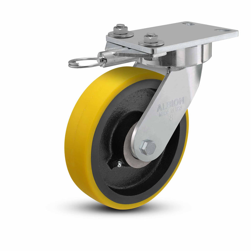 38PF08228SL is a 8" x 2" wide wheel swivel caster with a heavy-duty polyurethane-on-iron wheel and 6-1/4'' x 4-1/2'' top plate designed and constructed for highly ergonomic, durable, and quiet operation. Featuring a USA-made rig with a sealed-precision-ball-bearing raceway and extended lead, this caster provides effortless mobility and is extremely quiet, providing a safer working environment for your employees. The caster requires no maintenance for life, featuring sealed precision ball bearings in wheel and swivel section (for swivel models). A robust 5/16" HSLA top plate and 1/4" steel leg construction with fully welded legs (welded inside and outside to yoke base) allow these highly ergonomic casters to perform at higher load capacities than traditional casters, even with the extended lead – which helps smoothly and easily align the casters when turning while also reducing unwanted chatter from towed or faster moving equipment. The heavy-duty and ergonomic polyurethane wheel tread is securely bonded to a precision machined and heavy-duty cast iron core, featuring precision ball bearings for smooth and reliable mobility under both manual and heavy towed applications (95 Shore A hardness with radius tread). A swivel lock is included to allow for easy steering; simply engage the swivel into one of the four positions to easily turn the swivel caster in a rigid caster (release to turn it right back into a free swiveling caster). This maintenance-free and ergonomic series also features: