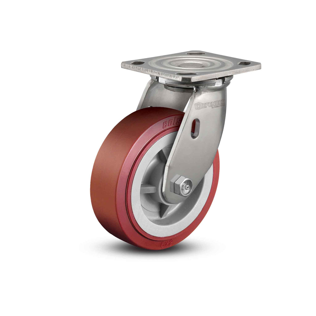 The Colson D4.04109.921 SS swivel caster features a 4" x 2" Polyurethane HI-TECH wheel and a 4" x 4-1/2" Top Plate, capable of a 600 lb. capacity per caster. Complete caster specifications and downloadable CAD model are provided below. The Colson D4 Defender is the ideal 2” wide caster solution for customers requiring lasting performance and corrosion resistance. Manufactured from Type 304 stainless steel and polished, this series provides premium features and a critical defense to applications exposed to washdowns, cleaning agents, steam, caustic solutions, and other environmental conditions that eventually cause oxidation and failure in standard casters. From the standard FDA-approved performance food-grade grease, 3/4” permanent rivet kingpin, and top-performing wheels in the industry—including the Performa Rubber wheel—the Defender D4 will continue to perform through the toughest of elements.