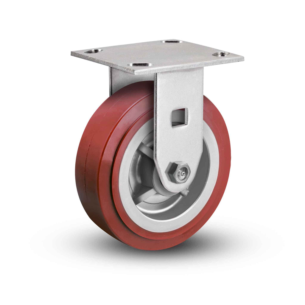 The Pemco SSER6X2TUMB rigid caster features a 4" x 2" Thermo-Urethane maroon wheel and a 4" x 4-1/2" Top Plate, capable of a 720 lb. capacity per caster. Complete caster specifications and downloadable CAD model are provided below. E-line Stainless Steel casters are ideal for harsh environments where frequent wash downs, chemicals, and other corrosive elements cause zinc-plated casters to rust or corrode. Featuring a more economical construction than our premium Defender D4 Series, this series has become a favorite entry-level stainless steel solution for many OEMs, fabricators, and caster replacement customers needing to prevent corrosion and rust. If you need more capacity or are dealing with more rugged applications, be sure to check out our stainless steel Defender D4 Series, 120 Kingpinless Series, or ultra-heavy duty 330 Kingpinless Series. E-line Stainless Steel features:
